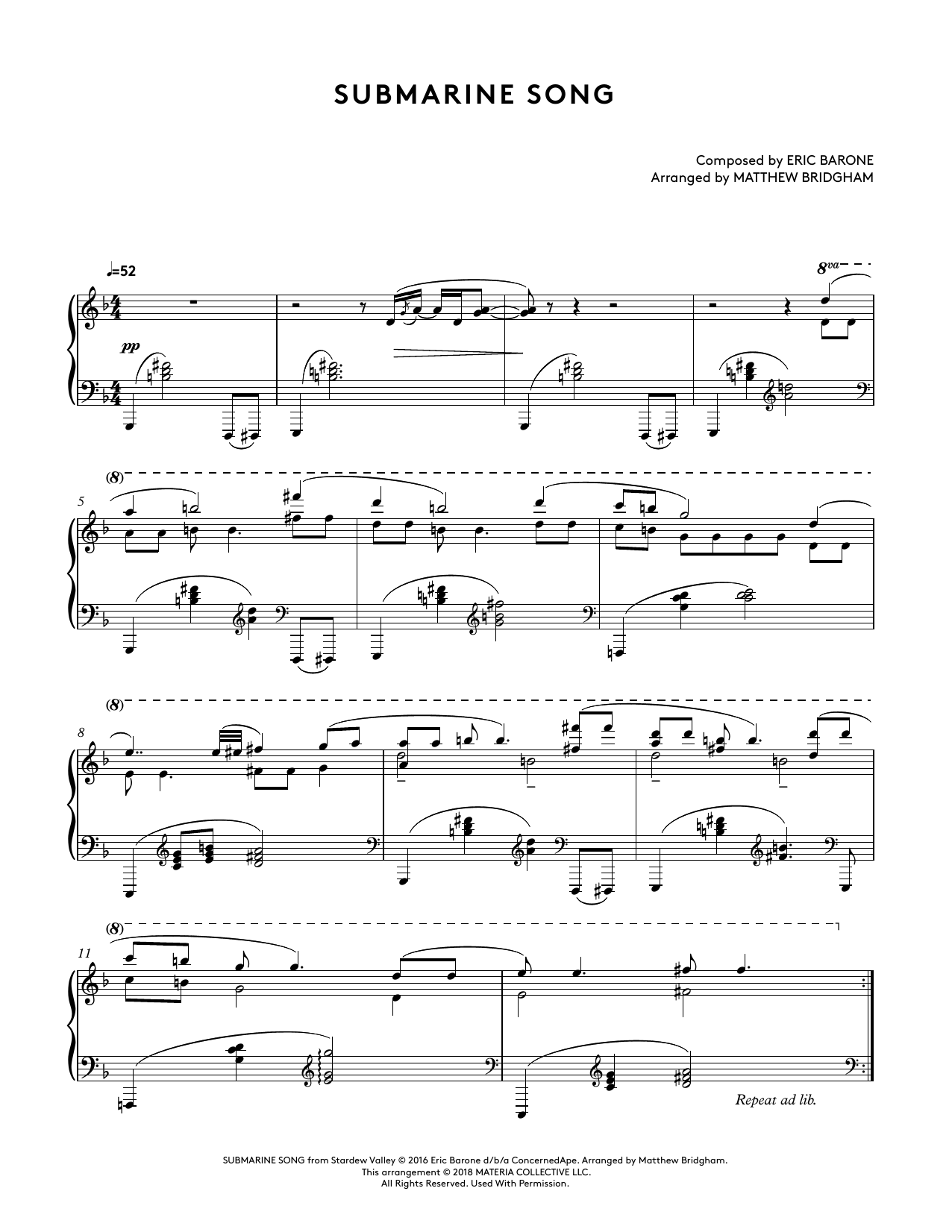 Download or print Eric Barone Submarine Song (from Stardew Valley Piano Collections) (arr. Matthew Bridgham) sheet music, chords and digital score arranged for Piano Solo. This Video Game score includes 2 page(s).