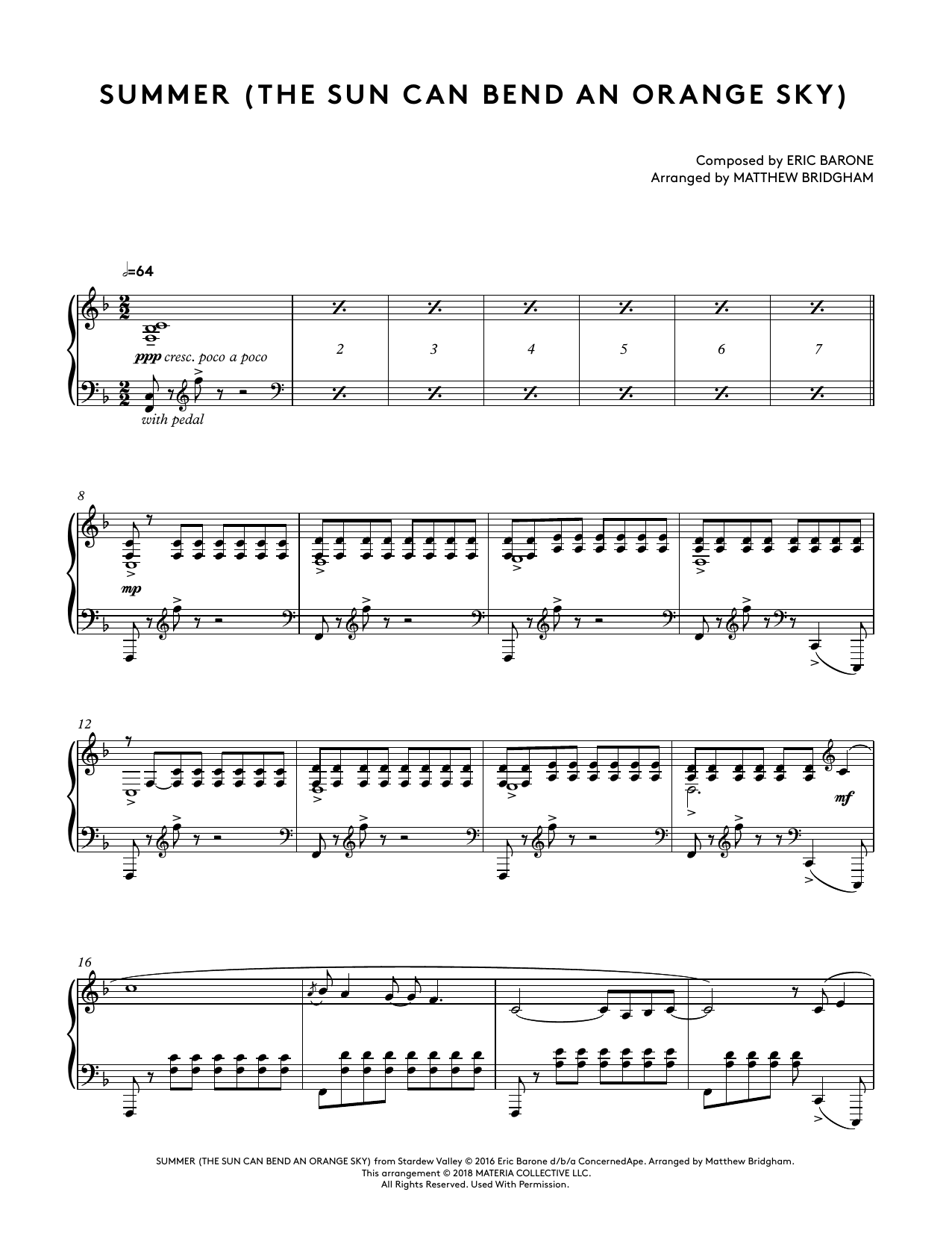 Download or print Eric Barone Summer (The Sun Can Bend An Orange Sky) (Stardew Valley Piano Collections) (arr. Matthew Bridgham) sheet music, chords and digital score arranged for Piano Solo. This Video Game score includes 6 page(s).