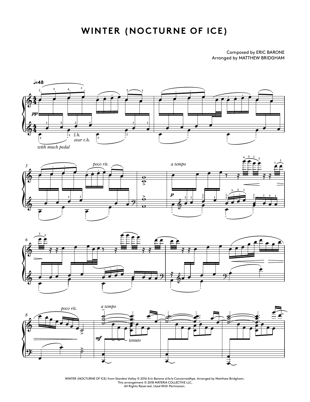 Download or print Eric Barone Winter (Nocturne Of Ice) (from Stardew Valley Piano Collections) (arr. Matthew Bridgham) sheet music, chords and digital score arranged for Piano Solo. This Video Game score includes 3 page(s).