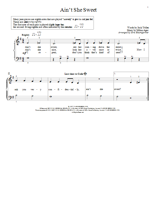 Download or print Eric Baumgartner Ain't She Sweet sheet music, chords and digital score arranged for Educational Piano. This Pop score includes 2 page(s).