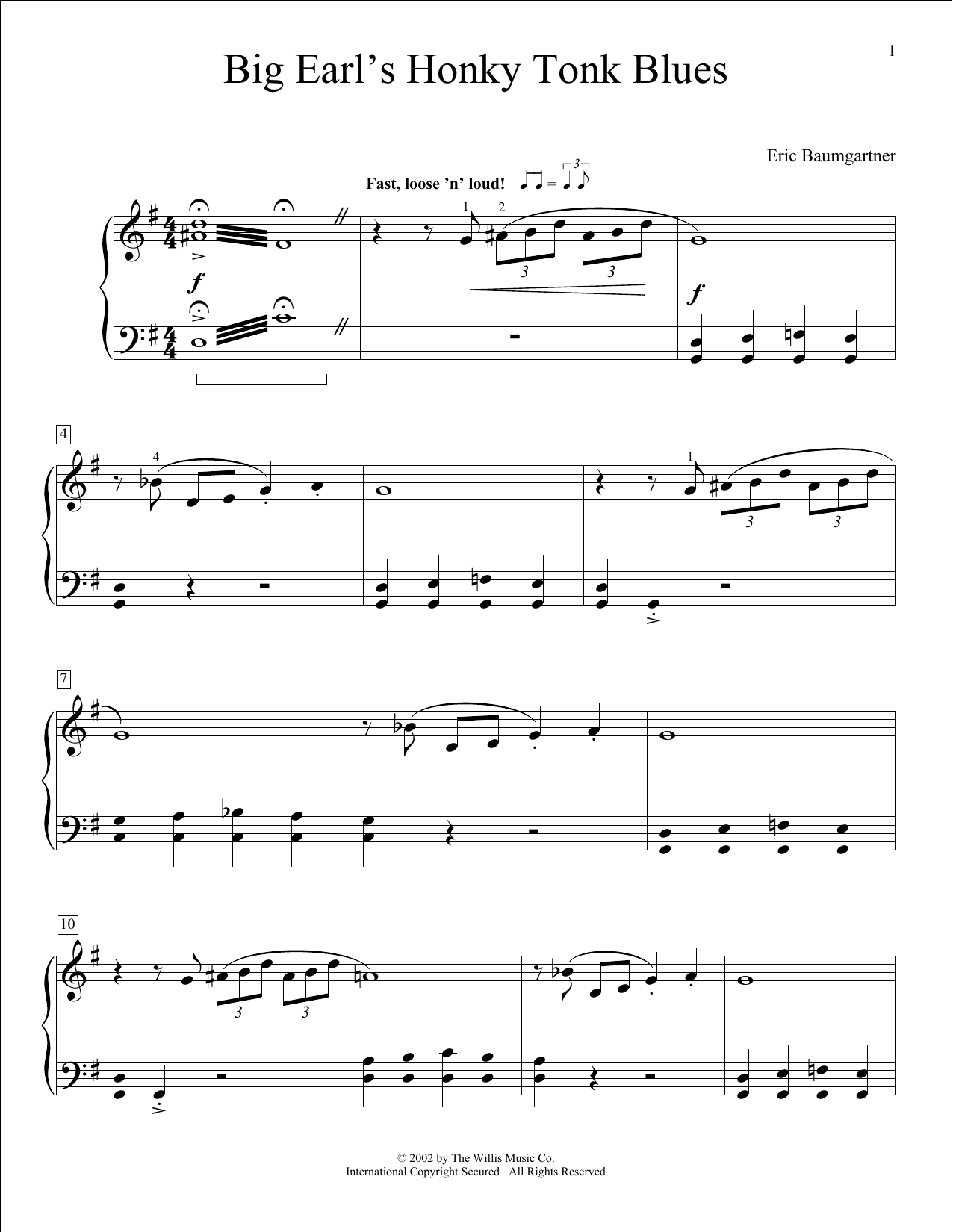 Download or print Eric Baumgartner Big Earl's Honky-Tonk Blues sheet music, chords and digital score arranged for Educational Piano. This Jazz score includes 3 page(s).