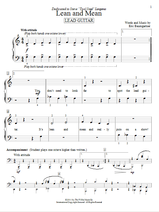Download or print Eric Baumgartner Lean And Mean (Lead Guitar) sheet music, chords and digital score arranged for Educational Piano. This Children score includes 2 page(s).