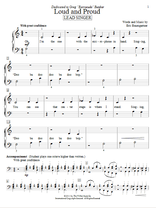 Download or print Eric Baumgartner Loud And Proud (Lead Singer) sheet music, chords and digital score arranged for Educational Piano. This Children score includes 2 page(s).