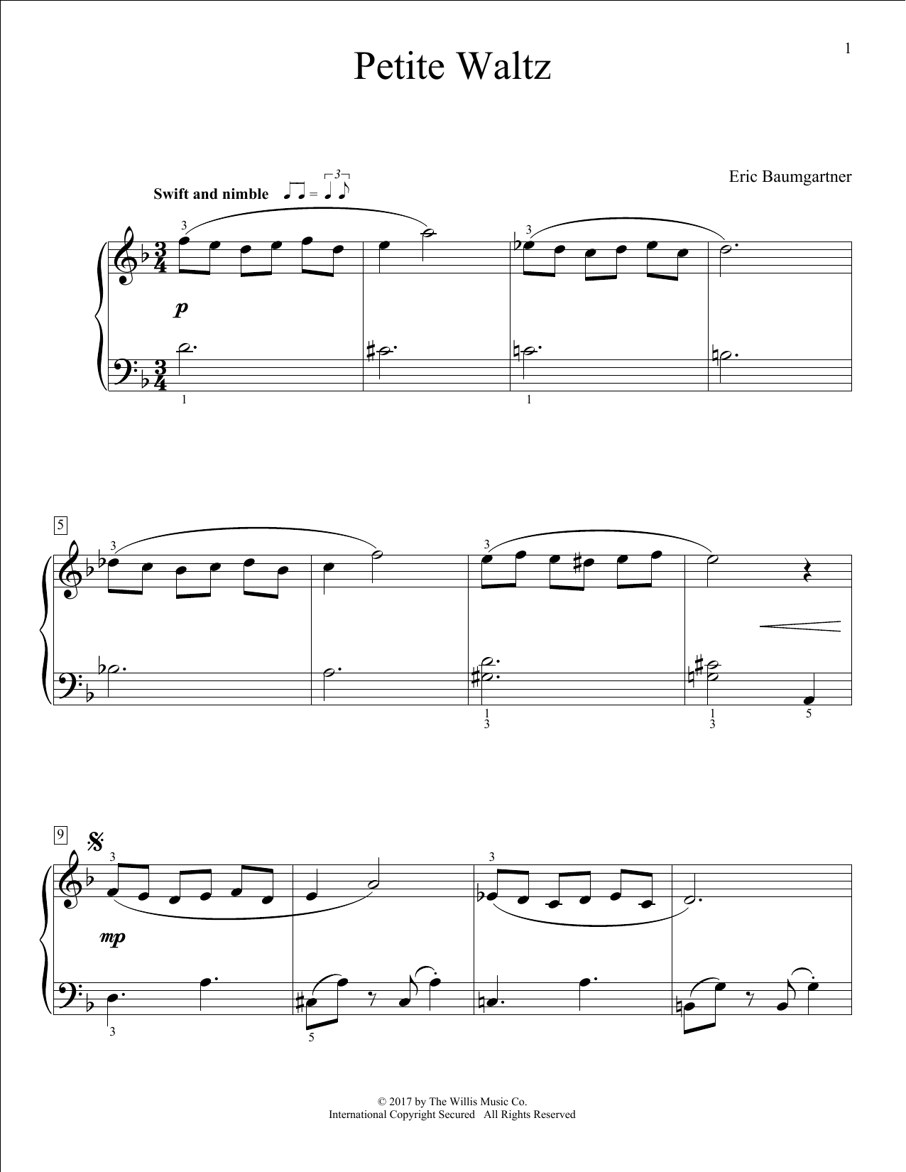 Download or print Eric Baumgartner Petite Waltz sheet music, chords and digital score arranged for Educational Piano. This Jazz score includes 2 page(s).
