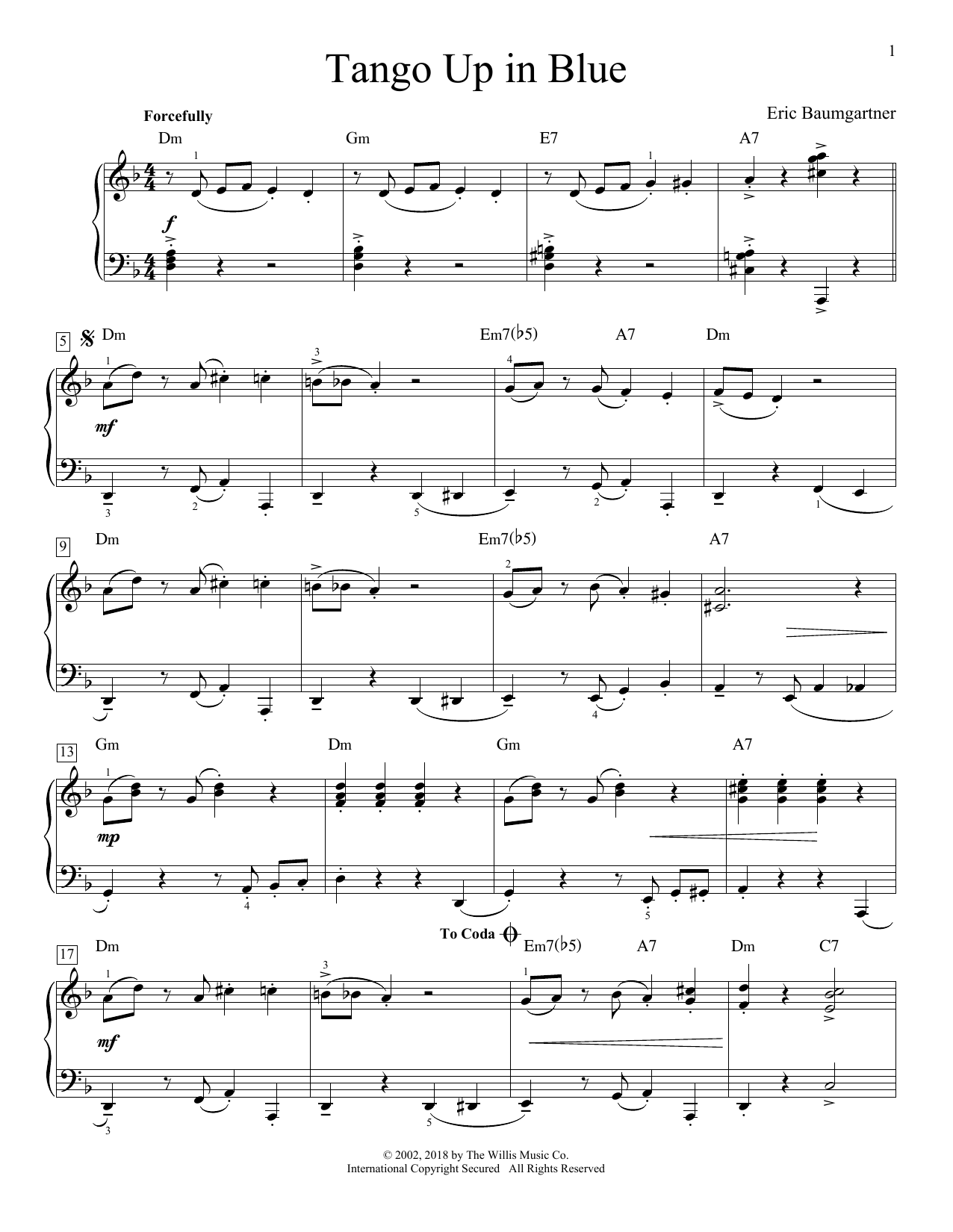 Download or print Eric Baumgartner Tango Up In Blue sheet music, chords and digital score arranged for Educational Piano. This Jazz score includes 2 page(s).