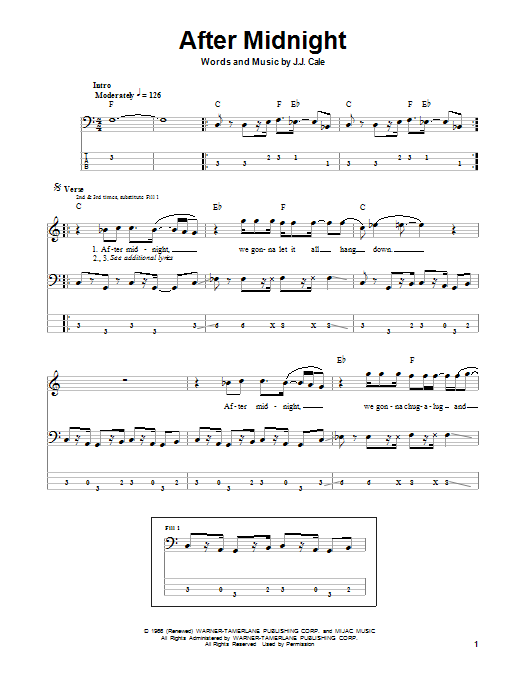 Download or print Eric Clapton After Midnight sheet music, chords and digital score arranged for Guitar Tab. This Blues score includes 6 page(s).