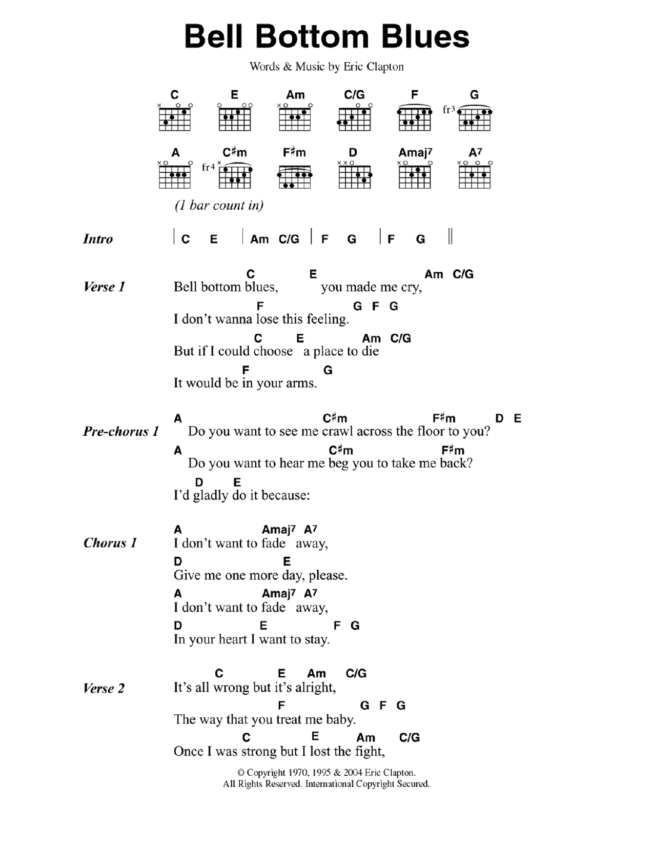 Download or print Derek & the Dominos Bell Bottom Blues sheet music, chords and digital score arranged for Guitar Chords/Lyrics. This Blues score includes 2 page(s).