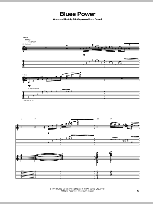 Download or print Eric Clapton Blues Power sheet music, chords and digital score arranged for Guitar Tab. This Blues score includes 9 page(s).