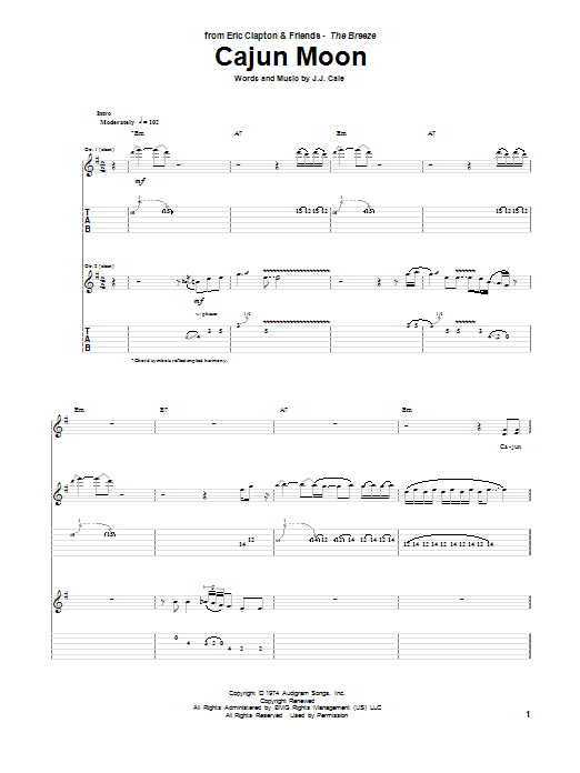 Download or print Eric Clapton Cajun Moon sheet music, chords and digital score arranged for Guitar Tab. This Blues score includes 7 page(s).