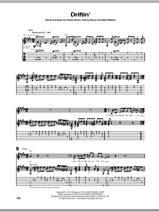 Download or print Eric Clapton Driftin' Blues sheet music, chords and digital score arranged for Guitar Tab. This Blues score includes 4 page(s).