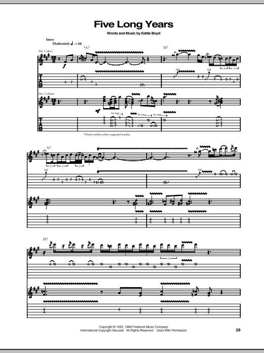 Download or print Eric Clapton Five Long Years sheet music, chords and digital score arranged for Guitar Tab. This Blues score includes 16 page(s).