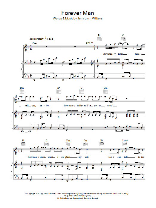 Download or print Eric Clapton Forever Man sheet music, chords and digital score arranged for Piano, Vocal & Guitar Chords. This Pop score includes 6 page(s).