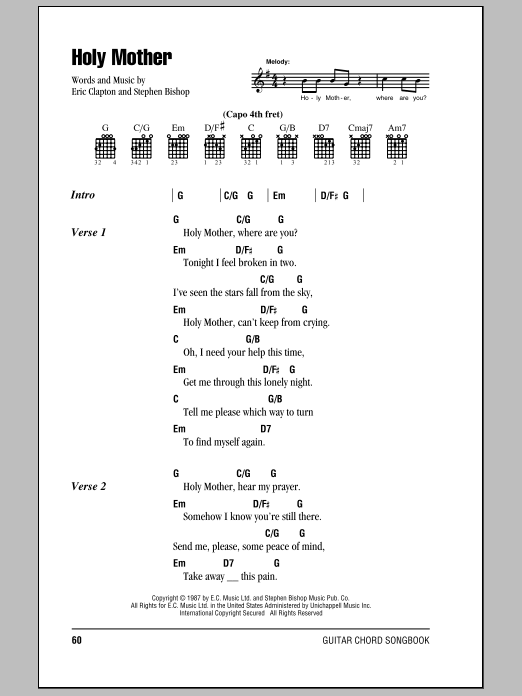 Download or print Eric Clapton Holy Mother sheet music, chords and digital score arranged for Guitar Chords/Lyrics. This Rock score includes 2 page(s).