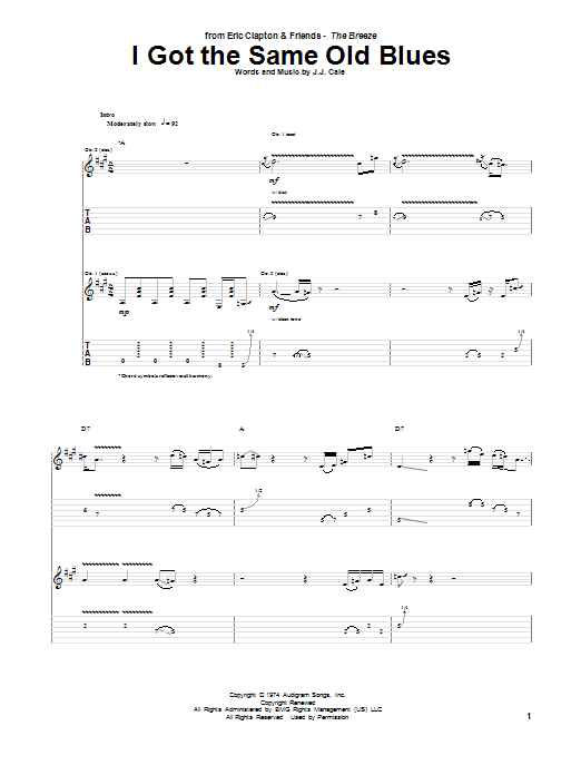 Download or print Eric Clapton I Got The Same Old Blues sheet music, chords and digital score arranged for Guitar Tab. This Blues score includes 9 page(s).