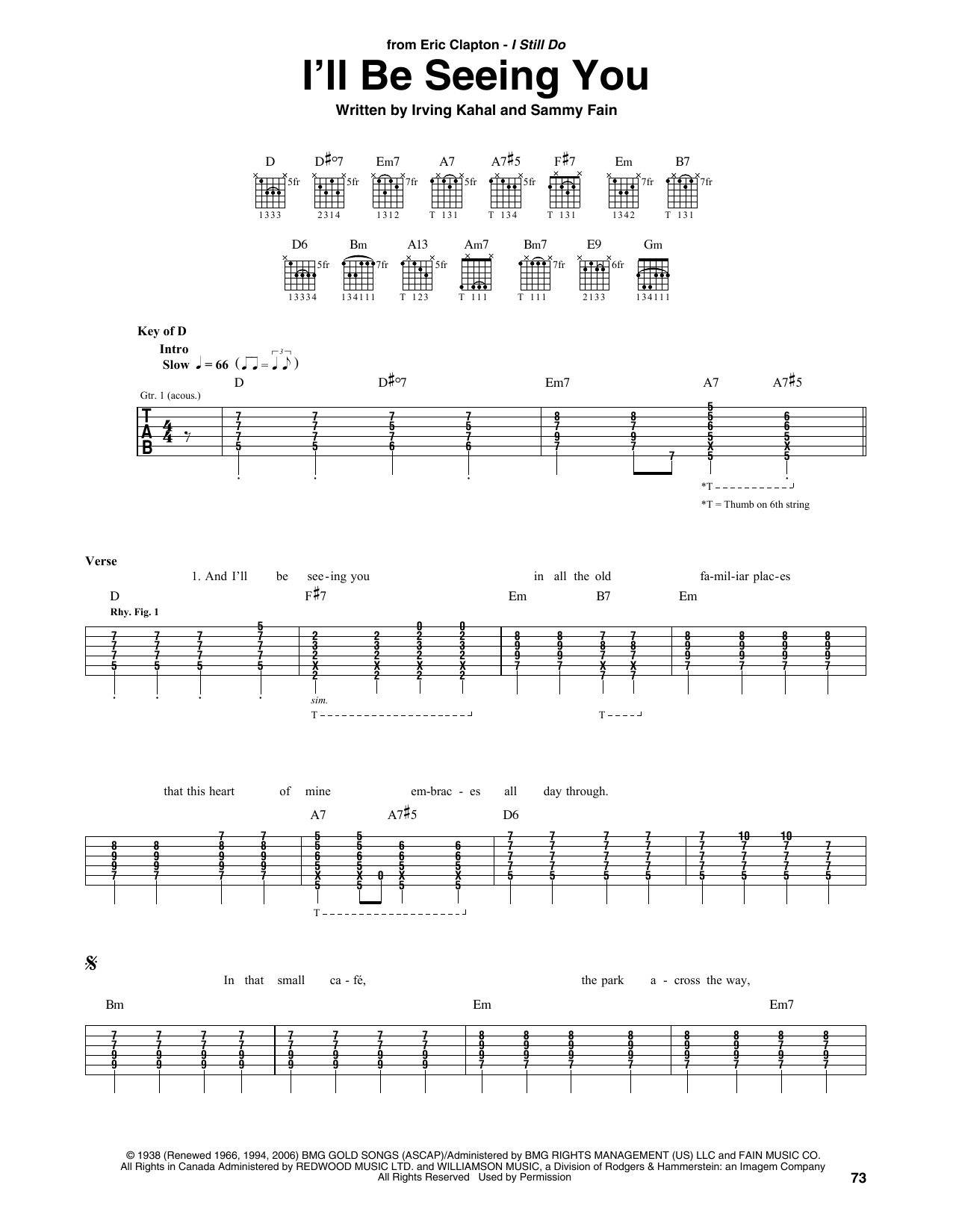 Download or print Eric Clapton I'll Be Seeing You sheet music, chords and digital score arranged for Guitar Rhythm Tab. This Blues score includes 3 page(s).
