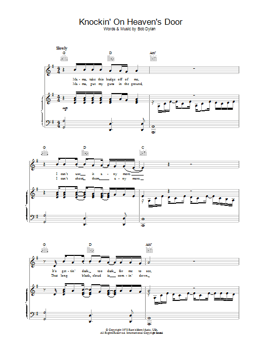 Download or print Bob Dylan Knockin' On Heaven's Door sheet music, chords and digital score arranged for Guitar Chords/Lyrics. This Folk score includes 2 page(s).