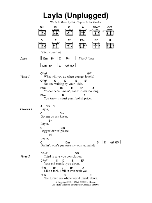 Download or print Eric Clapton Layla (unplugged) sheet music, chords and digital score arranged for Guitar Chords/Lyrics. This Rock score includes 2 page(s).