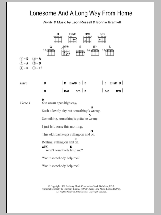 Download or print Eric Clapton Lonesome And A Long Way From Home sheet music, chords and digital score arranged for Guitar Chords/Lyrics. This Rock score includes 2 page(s).