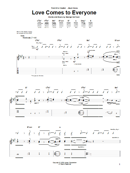 Download or print Eric Clapton Love Comes To Everyone sheet music, chords and digital score arranged for Guitar Tab. This Blues score includes 12 page(s).