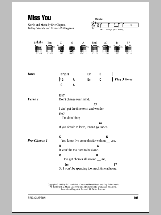 Download or print Eric Clapton Miss You sheet music, chords and digital score arranged for Guitar Chords/Lyrics. This Rock score includes 3 page(s).