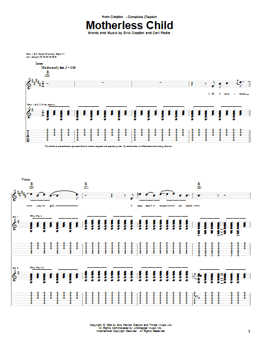 Download or print Eric Clapton Motherless Child sheet music, chords and digital score arranged for Guitar Chords/Lyrics. This Rock score includes 2 page(s).