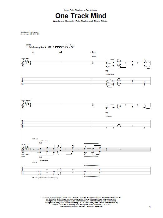 Download or print Eric Clapton One Track Mind sheet music, chords and digital score arranged for Guitar Tab. This Blues score includes 17 page(s).