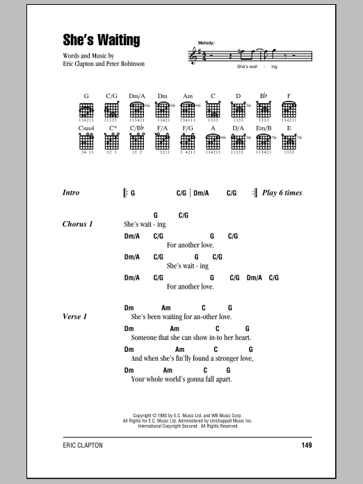 Download or print Eric Clapton She's Waiting sheet music, chords and digital score arranged for Guitar Tab. This Rock score includes 5 page(s).