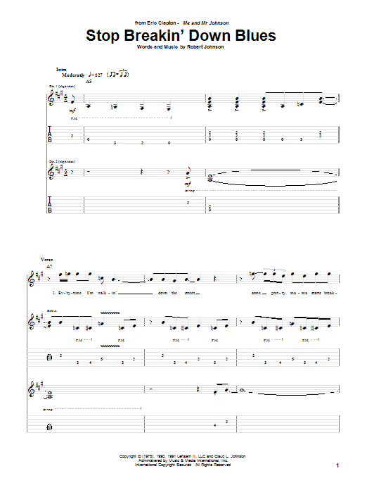 Download or print Eric Clapton Stop Breakin' Down Blues sheet music, chords and digital score arranged for Guitar Tab. This Blues score includes 7 page(s).