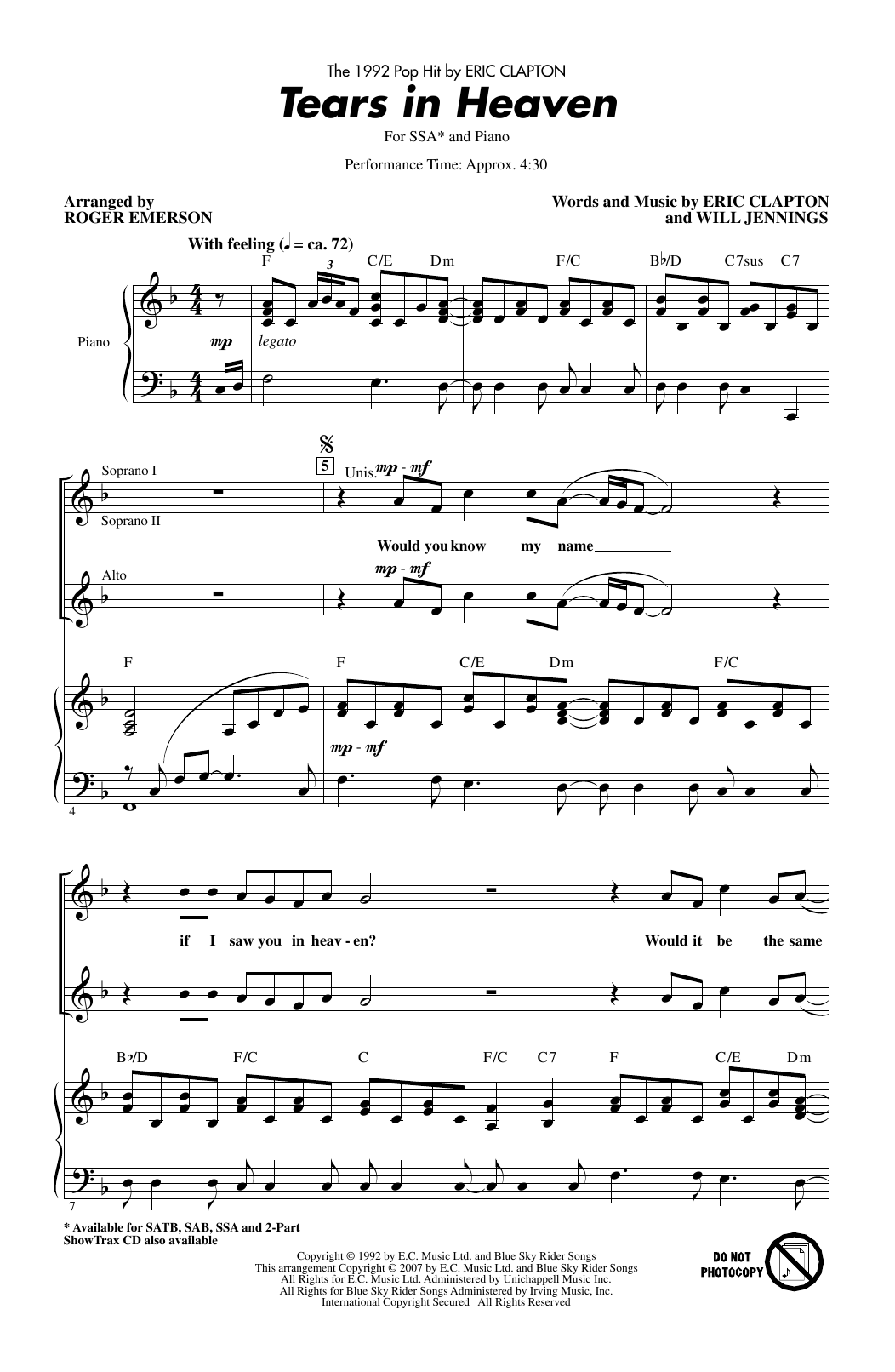 Download or print Eric Clapton Tears In Heaven (arr. Roger Emerson) sheet music, chords and digital score arranged for SSA Choir. This Rock score includes 7 page(s).