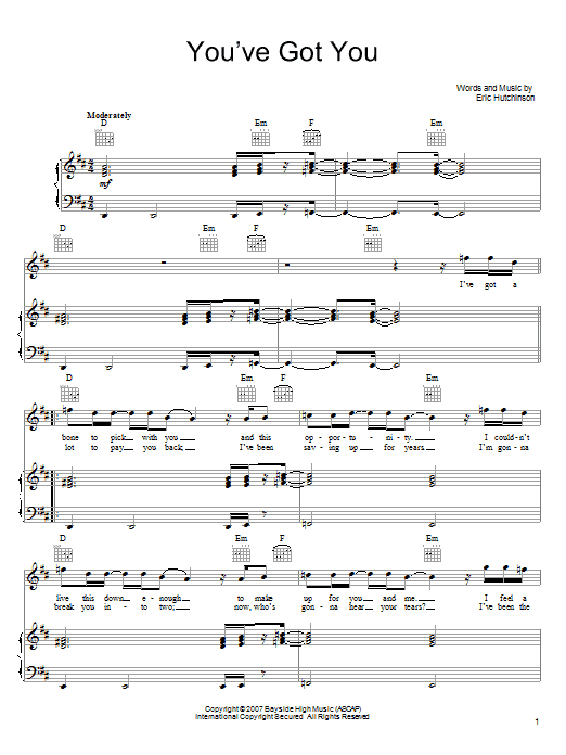 Download or print Eric Hutchinson You've Got You sheet music, chords and digital score arranged for Piano, Vocal & Guitar Chords (Right-Hand Melody). This Pop score includes 8 page(s).