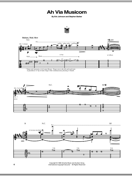 Download or print Eric Johnson Ah Via Musicom sheet music, chords and digital score arranged for Guitar Tab. This Pop score includes 4 page(s).