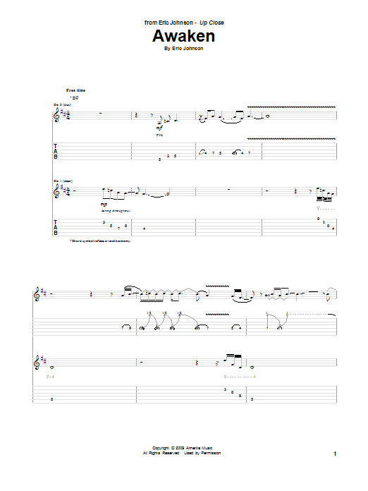 Download or print Eric Johnson Awaken sheet music, chords and digital score arranged for Guitar Tab. This Jazz score includes 3 page(s).