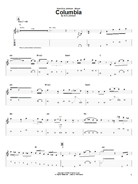Download or print Eric Johnson Columbia sheet music, chords and digital score arranged for Guitar Tab. This Pop score includes 6 page(s).