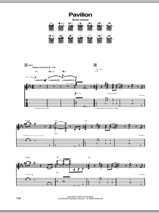Download or print Eric Johnson Pavilion sheet music, chords and digital score arranged for Guitar Tab. This Pop score includes 13 page(s).