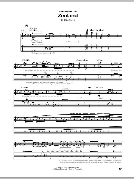 Download or print Eric Johnson Zenland sheet music, chords and digital score arranged for Guitar Tab. This Pop score includes 10 page(s).