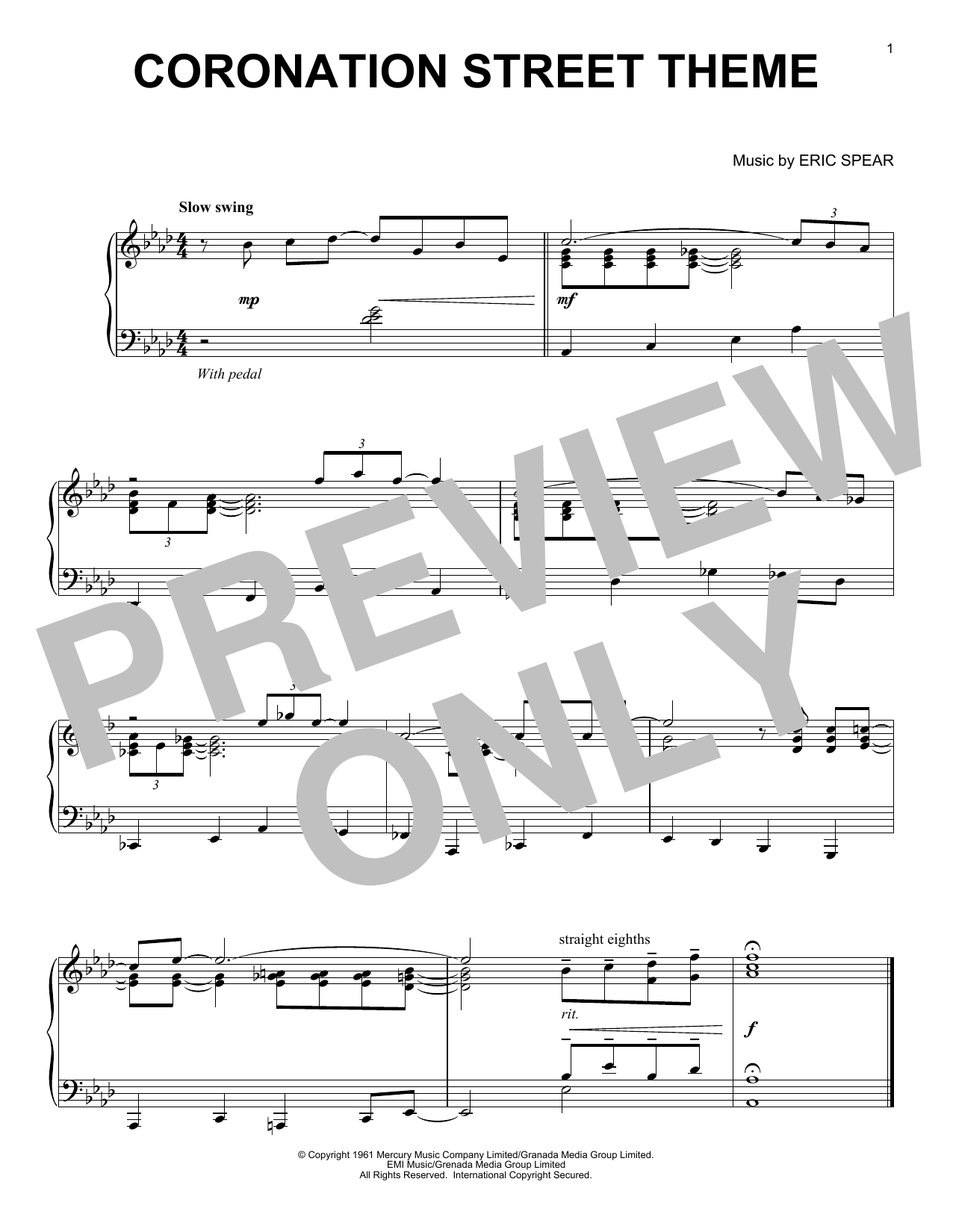 Download or print Eric Spear Coronation Street Theme sheet music, chords and digital score arranged for Piano Solo. This Film/TV score includes 1 page(s).