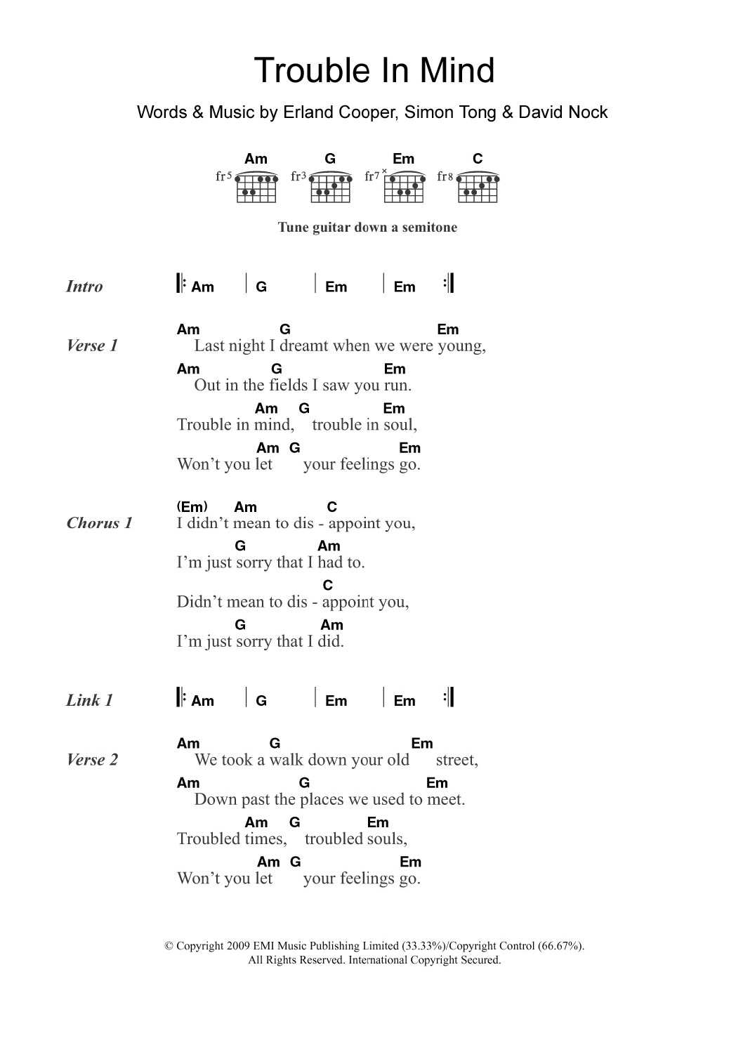 Download or print Erland & The Carnival Trouble In Mind sheet music, chords and digital score arranged for Guitar Chords/Lyrics. This Pop score includes 2 page(s).