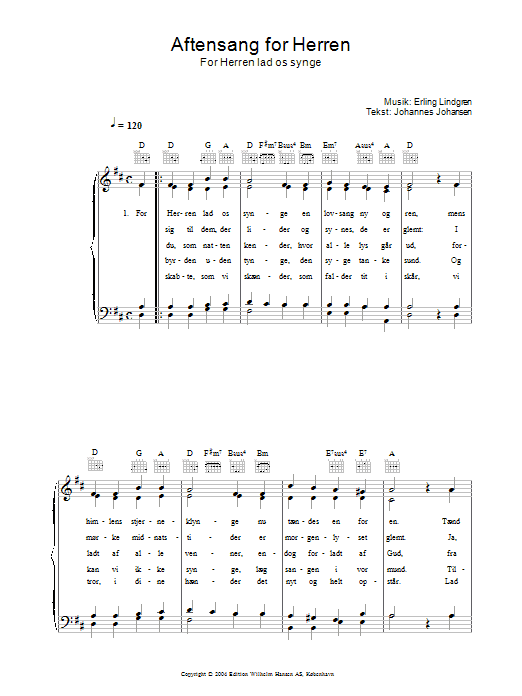 Download or print Erling Lindgren Aftensang For Herren - For Herren Lad Os Singe sheet music, chords and digital score arranged for Piano, Vocal & Guitar Chords. This Folk score includes 2 page(s).