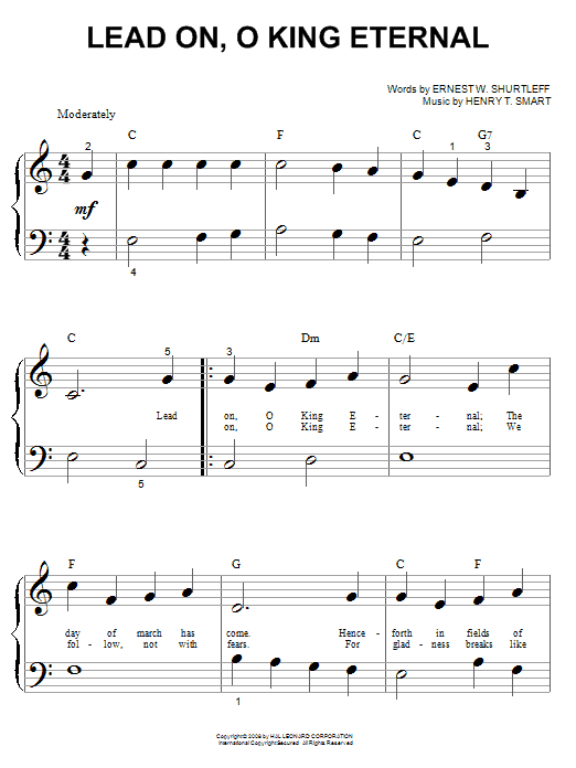 Download or print Ernest W. Shurtleff Lead On, O King Eternal sheet music, chords and digital score arranged for Piano Solo. This Christian score includes 3 page(s).