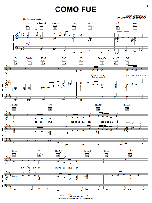 Download or print Ernesto Duarte Brito Como Fue sheet music, chords and digital score arranged for Piano, Vocal & Guitar Chords (Right-Hand Melody). This Latin score includes 3 page(s).
