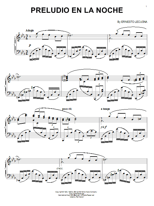 Download or print Ernesto Lecuona Preludio En La Noche sheet music, chords and digital score arranged for Piano Solo. This Latin score includes 4 page(s).