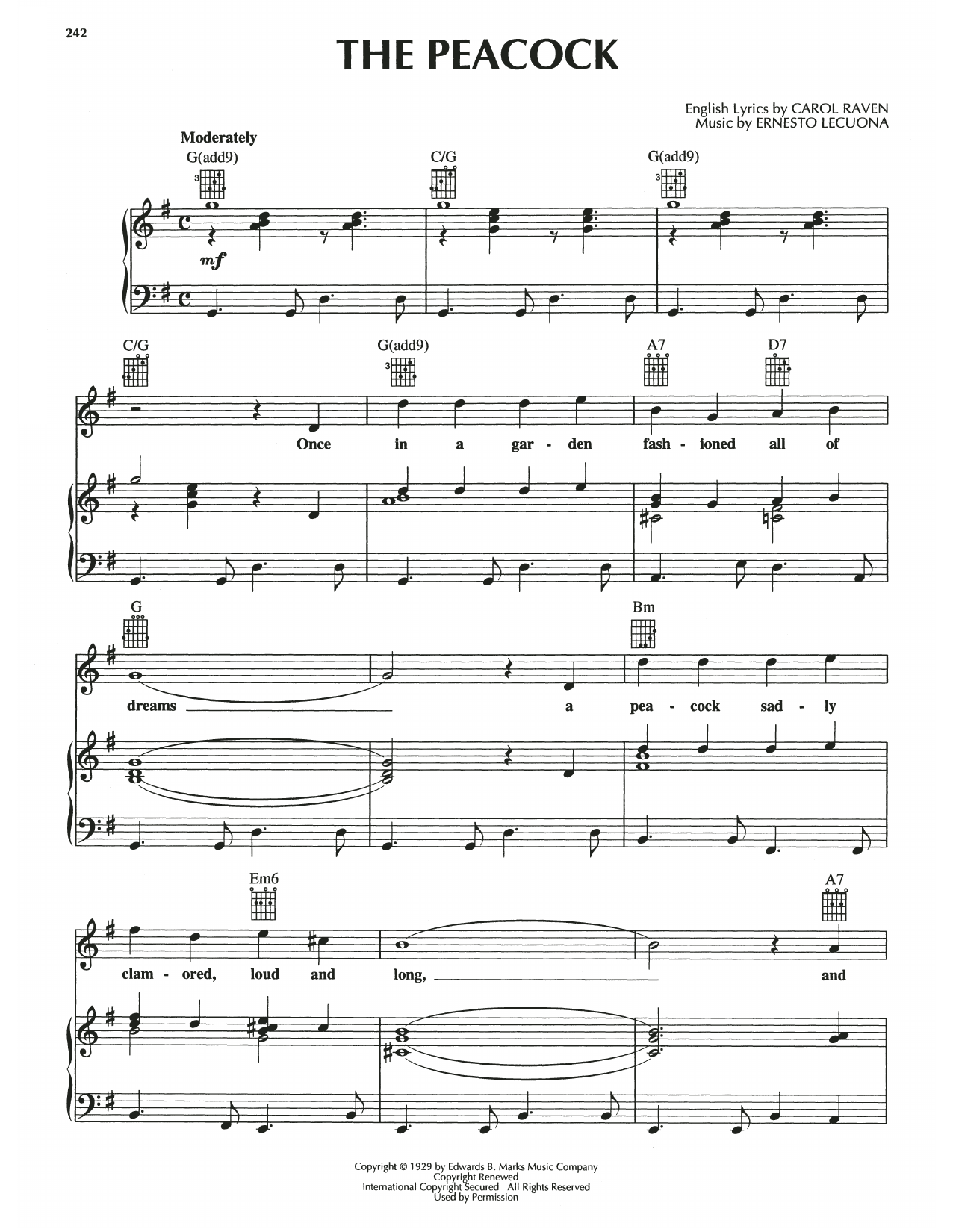 Download or print Ernesto Lecuona The Peacock sheet music, chords and digital score arranged for Piano, Vocal & Guitar Chords (Right-Hand Melody). This Jazz score includes 6 page(s).