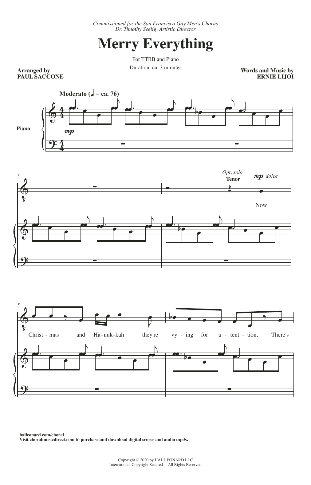 Download or print Ernie Lijoi Merry Everything (arr. Paul Saccone) sheet music, chords and digital score arranged for TTBB Choir. This Holiday score includes 10 page(s).