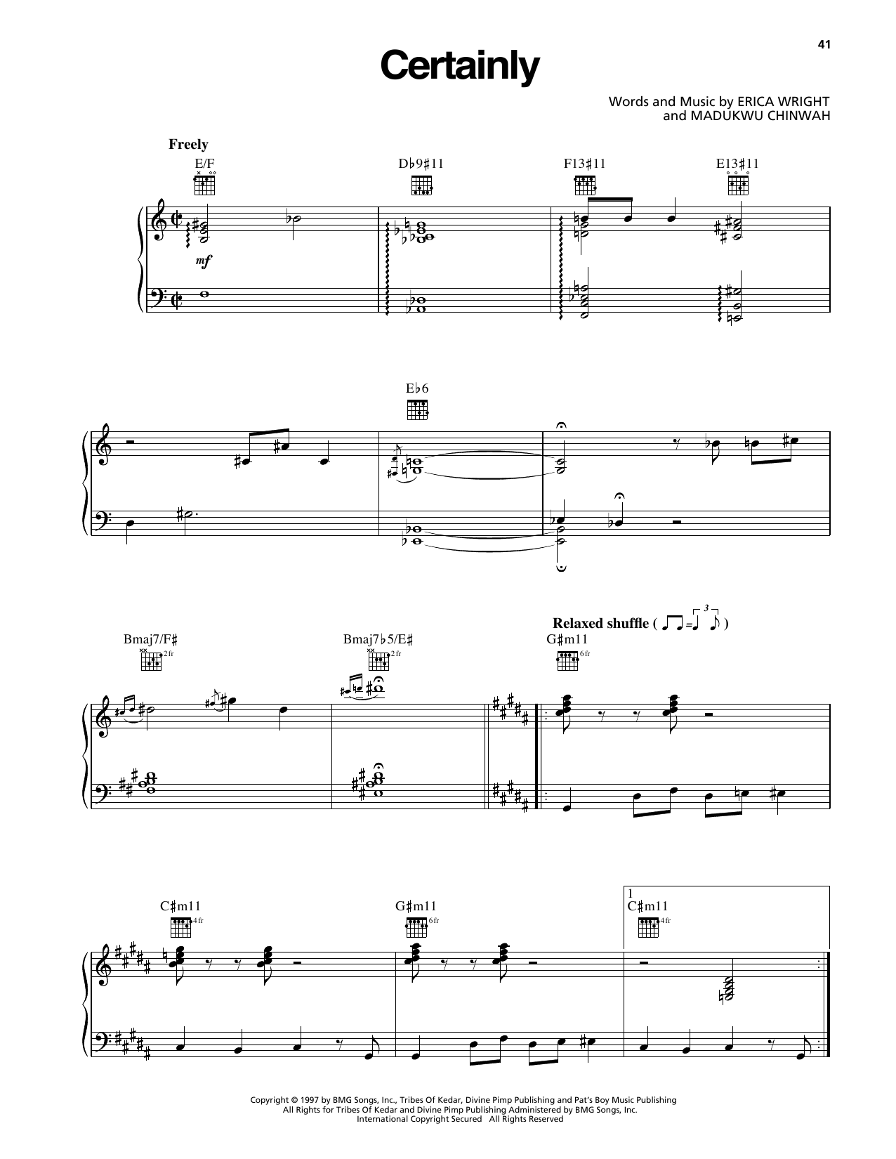 Download or print Erykah Badu Certainly sheet music, chords and digital score arranged for Piano, Vocal & Guitar Chords (Right-Hand Melody). This Pop score includes 10 page(s).
