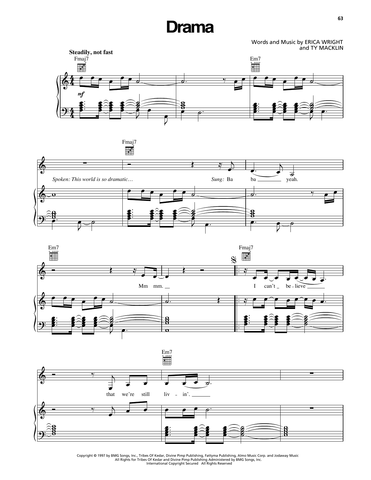 Download or print Erykah Badu Drama sheet music, chords and digital score arranged for Piano, Vocal & Guitar Chords (Right-Hand Melody). This Pop score includes 6 page(s).