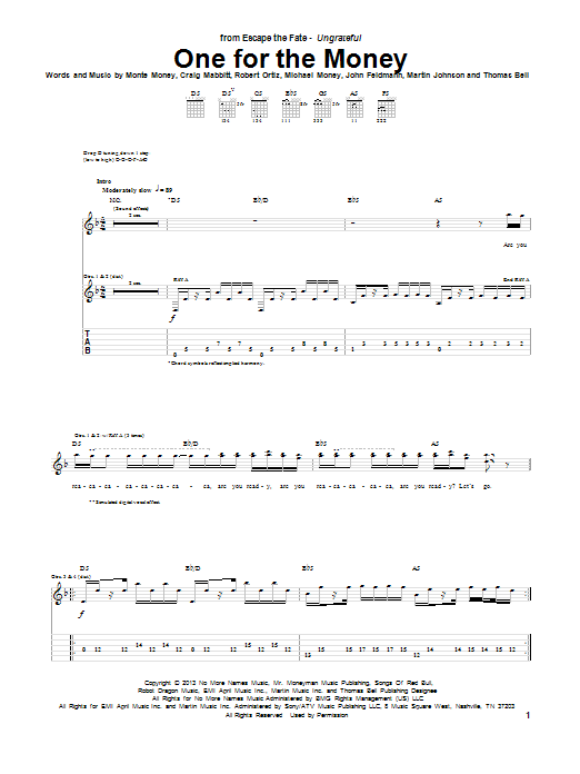Download or print Escape the Fate One For The Money sheet music, chords and digital score arranged for Guitar Tab. This Pop score includes 10 page(s).