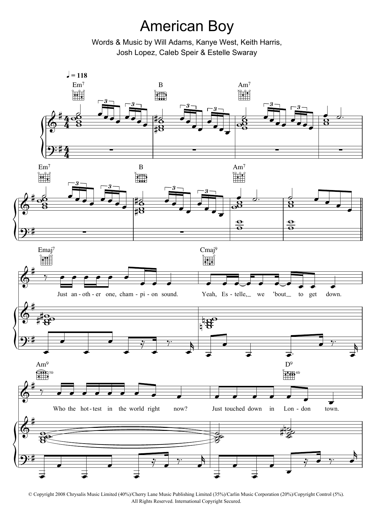 Download or print Estelle American Boy (featuring Kanye West) sheet music, chords and digital score arranged for Piano Chords/Lyrics. This Pop score includes 2 page(s).