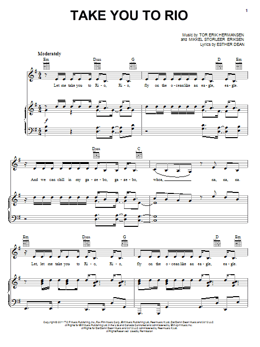 Download or print Esther Dean Take You To Rio sheet music, chords and digital score arranged for Piano, Vocal & Guitar Chords (Right-Hand Melody). This Children score includes 7 page(s).