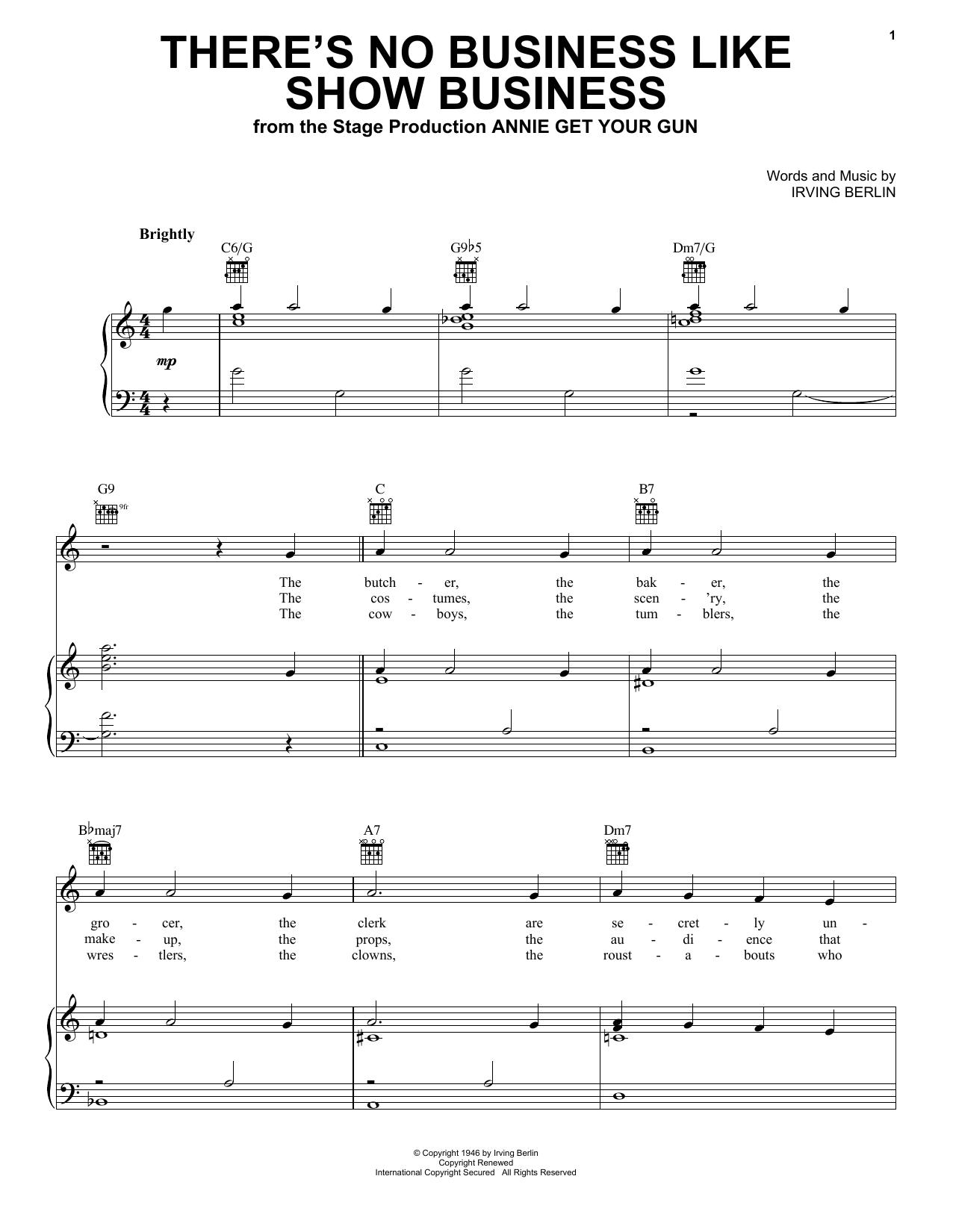 Download or print Ethel Merman There's No Business Like Show Business sheet music, chords and digital score arranged for Piano, Vocal & Guitar Chords (Right-Hand Melody). This Musical/Show score includes 6 page(s).