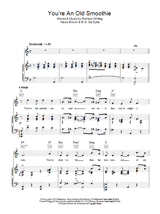 Download or print Ethel Merman You're An Old Smoothie sheet music, chords and digital score arranged for Piano, Vocal & Guitar Chords. This Standards score includes 5 page(s).